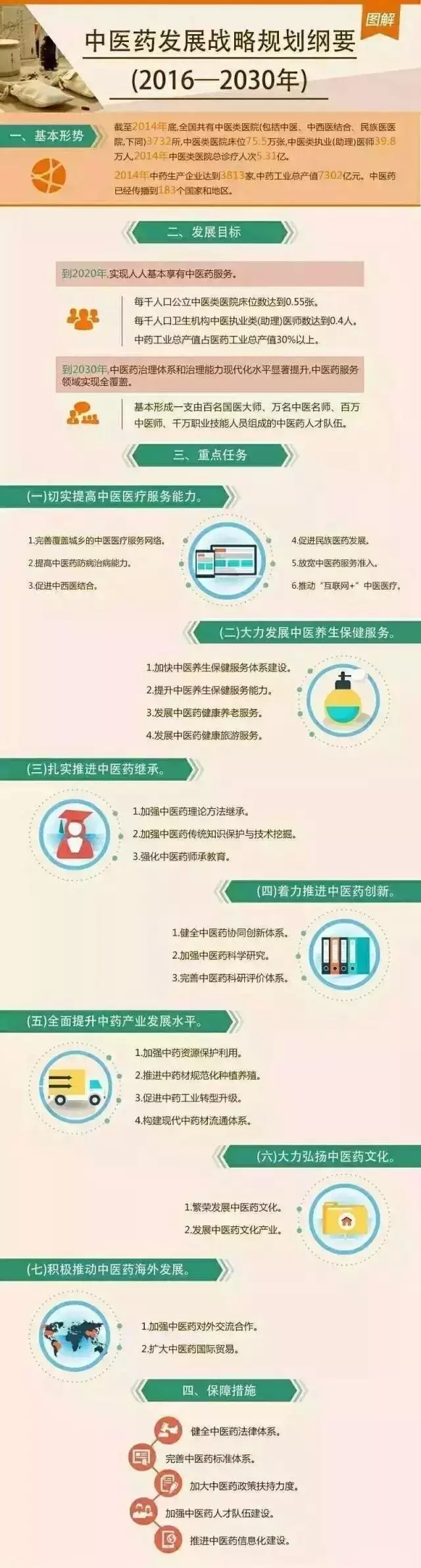 《纲要》提出,要坚持中西医并重,落实中医药与西医药的平等地位,遵循中医药发展规律,以推进继承创新为主题,以提高中医药发展水平为中心,以完善符合中医药特点的管理体制和政策机制为重点,以增进和维护人民群众健康为目标,拓展中医药服务领域,促进中西医结合,统筹推进中医药事业振兴发展。到2020年,实现人人基本享有中医药服务,中医药产业成为国民经济重要支柱之一;到2030年,中医药服务领域实现全覆盖,中医药健康服务能力显著增强,对经济社会发展作出更大贡献。