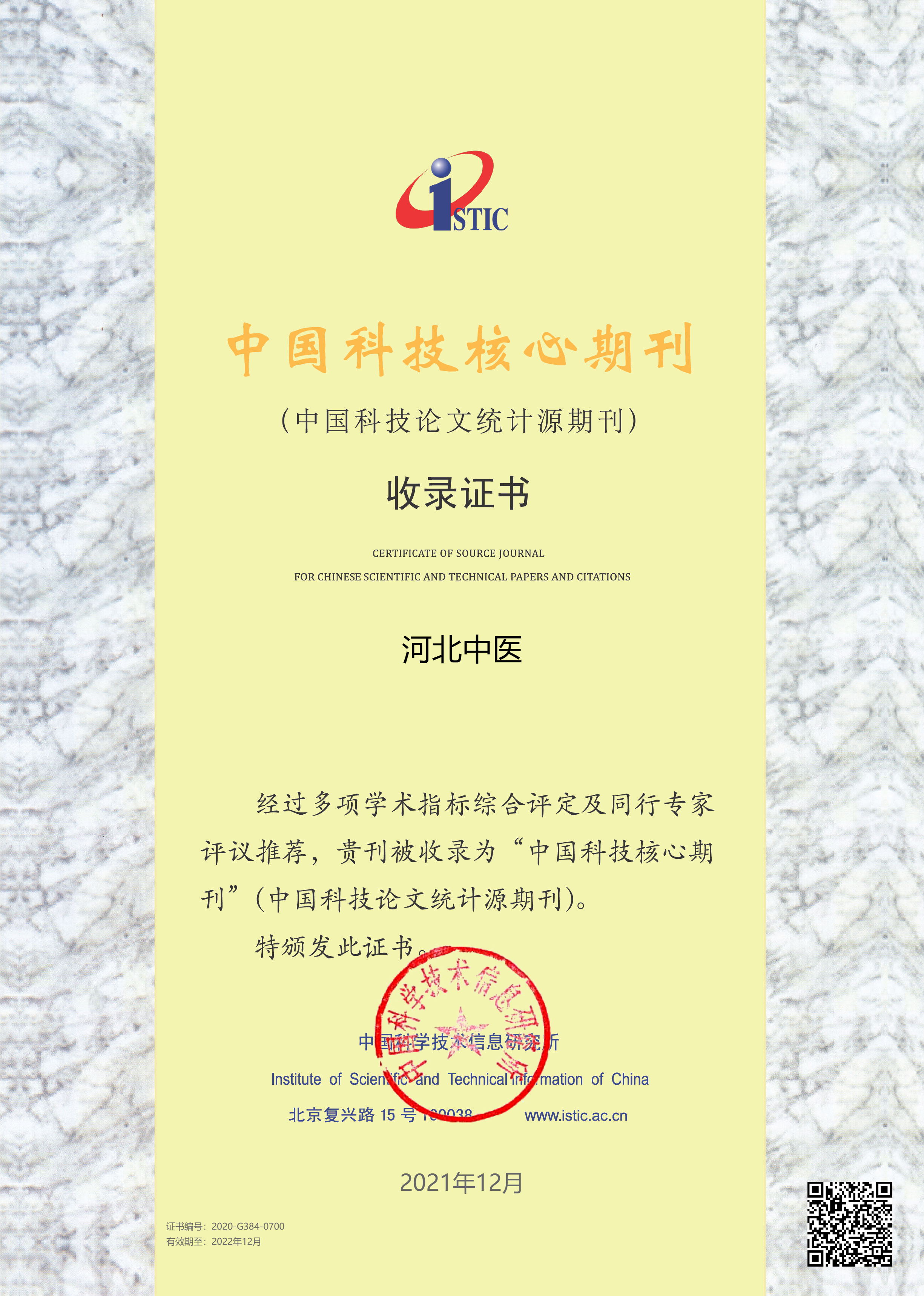 2021年12月27日,中国科学技术信息研究所通过线上直播举行了“2021年中国科技论文统计结果发布会”,经过多项严格的学术指标综合评定及国内同行专家评议推荐,《河北中医》杂志再次入选中国科技核心期刊(中国科技论文统计源期刊)。